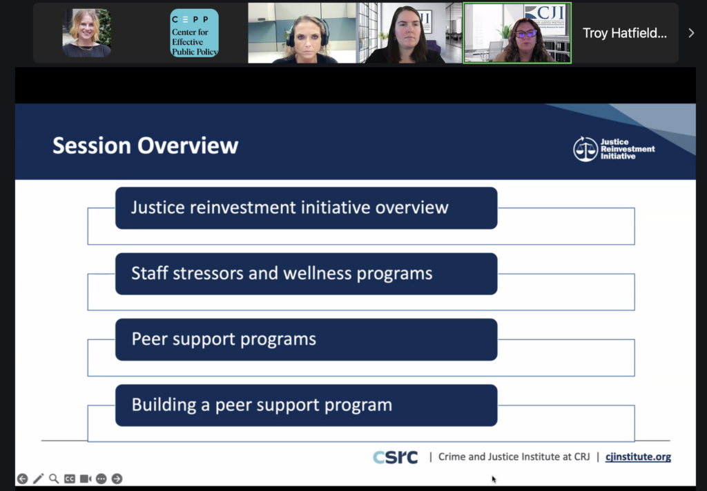 CSRC reviewed the history of staff wellness programs in criminal justice agencies, including available research on their effectiveness. This webinar focused on peer support programs, which pair staff members struggling with personal or professional stress with a colleague trained to provide support. Attendees learned about the benefits to individual staff and the entire agency, including an increased sense of community and removing the workplace stigma around asking for help. Attendees also learned basic skills that peer supporters need to communicate effectively with colleagues, as well as steps to bring staff wellness support to community supervision agencies and evaluate selected programs.